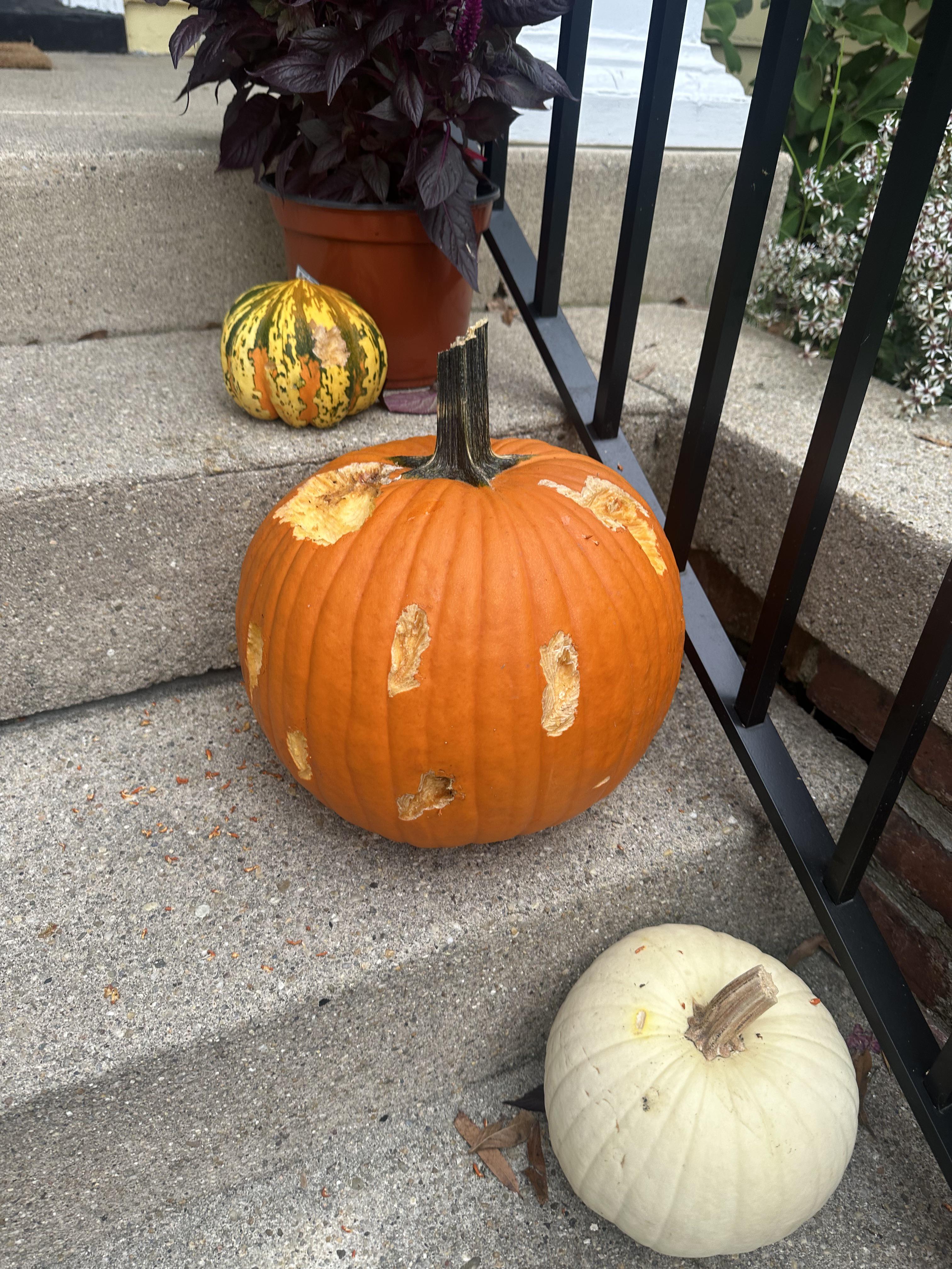 The neighborhood squirrels took charge of turning my parents’ pumpkin into a jack-o-lantern this year.