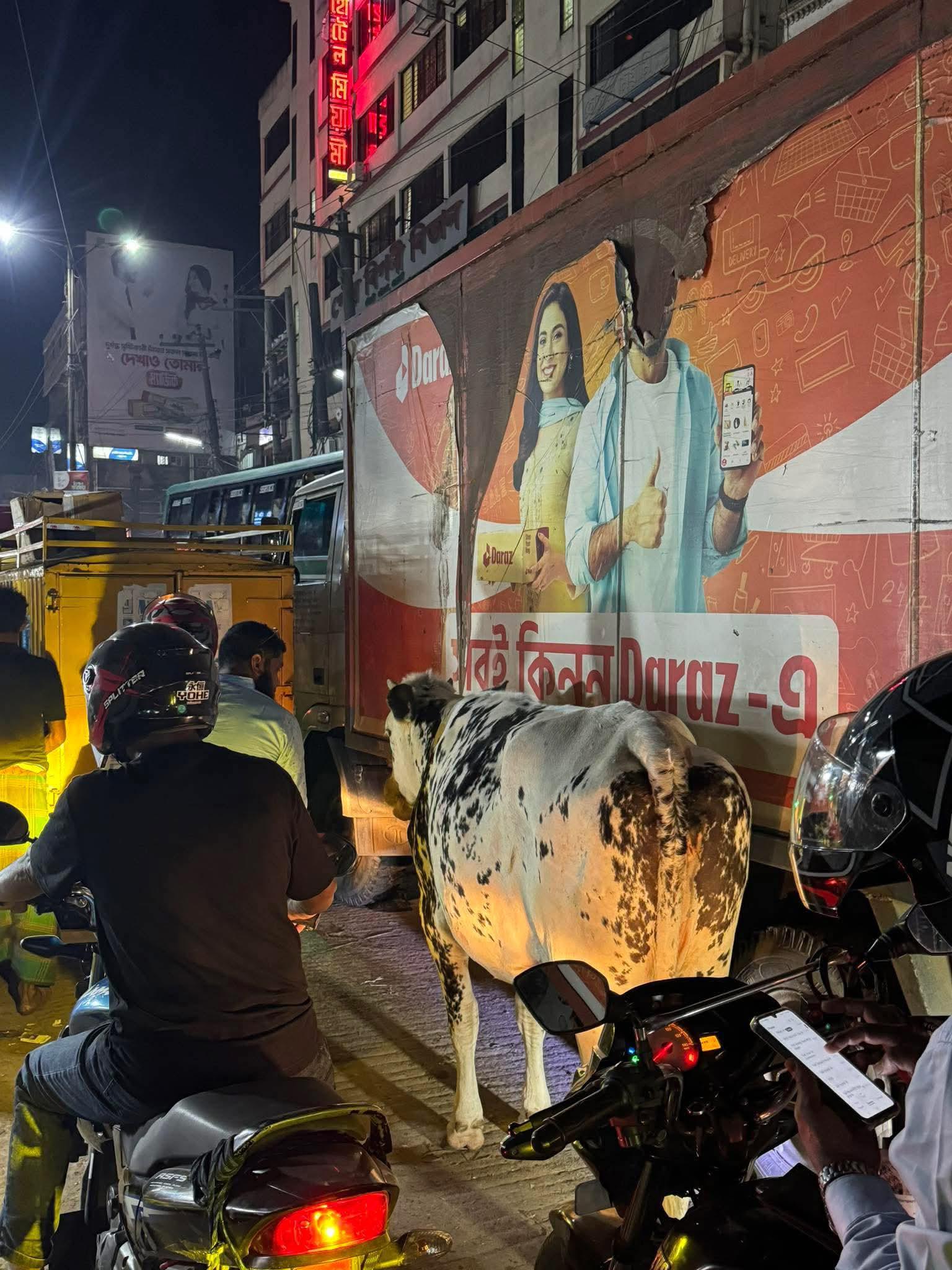 A cow stuck in traffic jam
