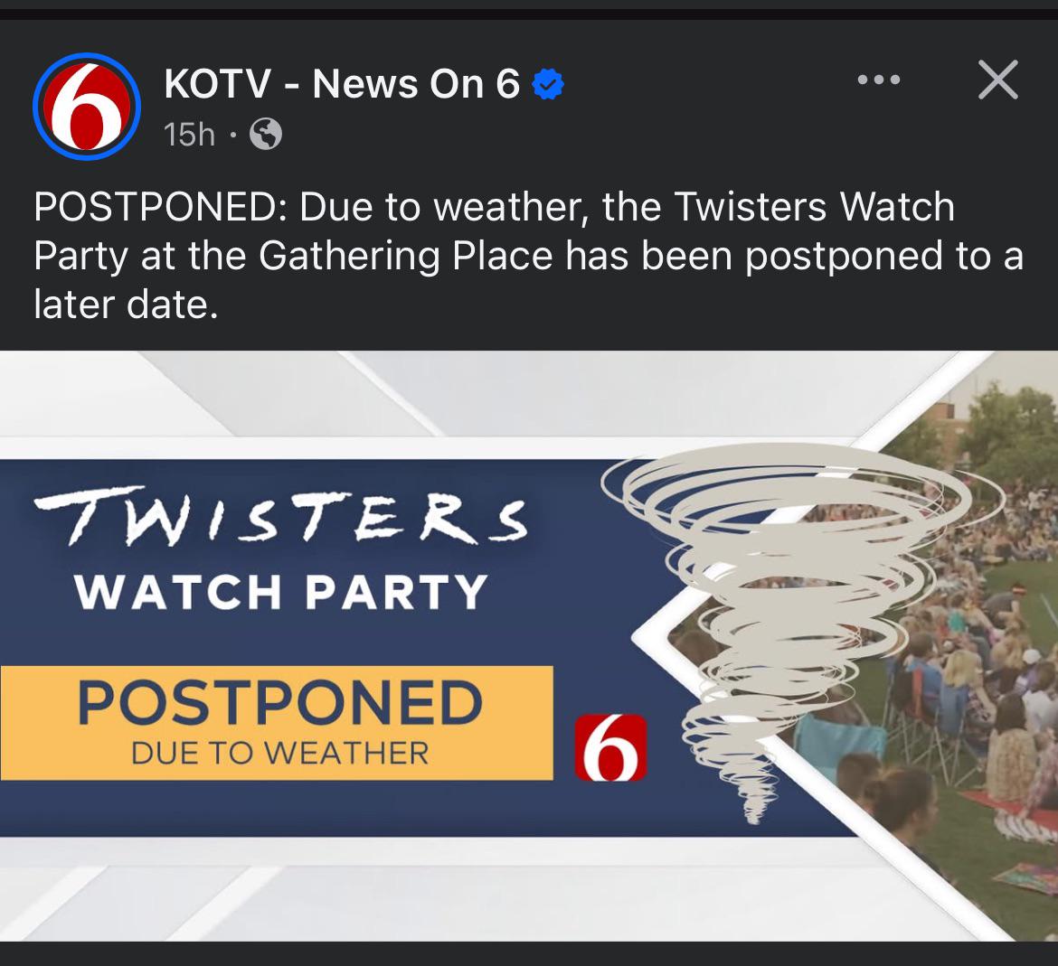 In Oklahoma the Twisters watch party is postponed due to possible Tornadoes