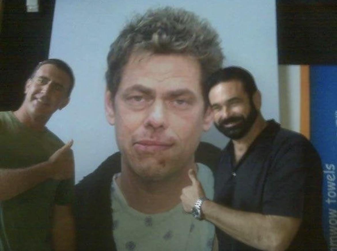 Billy Mays and Anthony Sullivan posing in front of the ShamWow guy’s mugshot